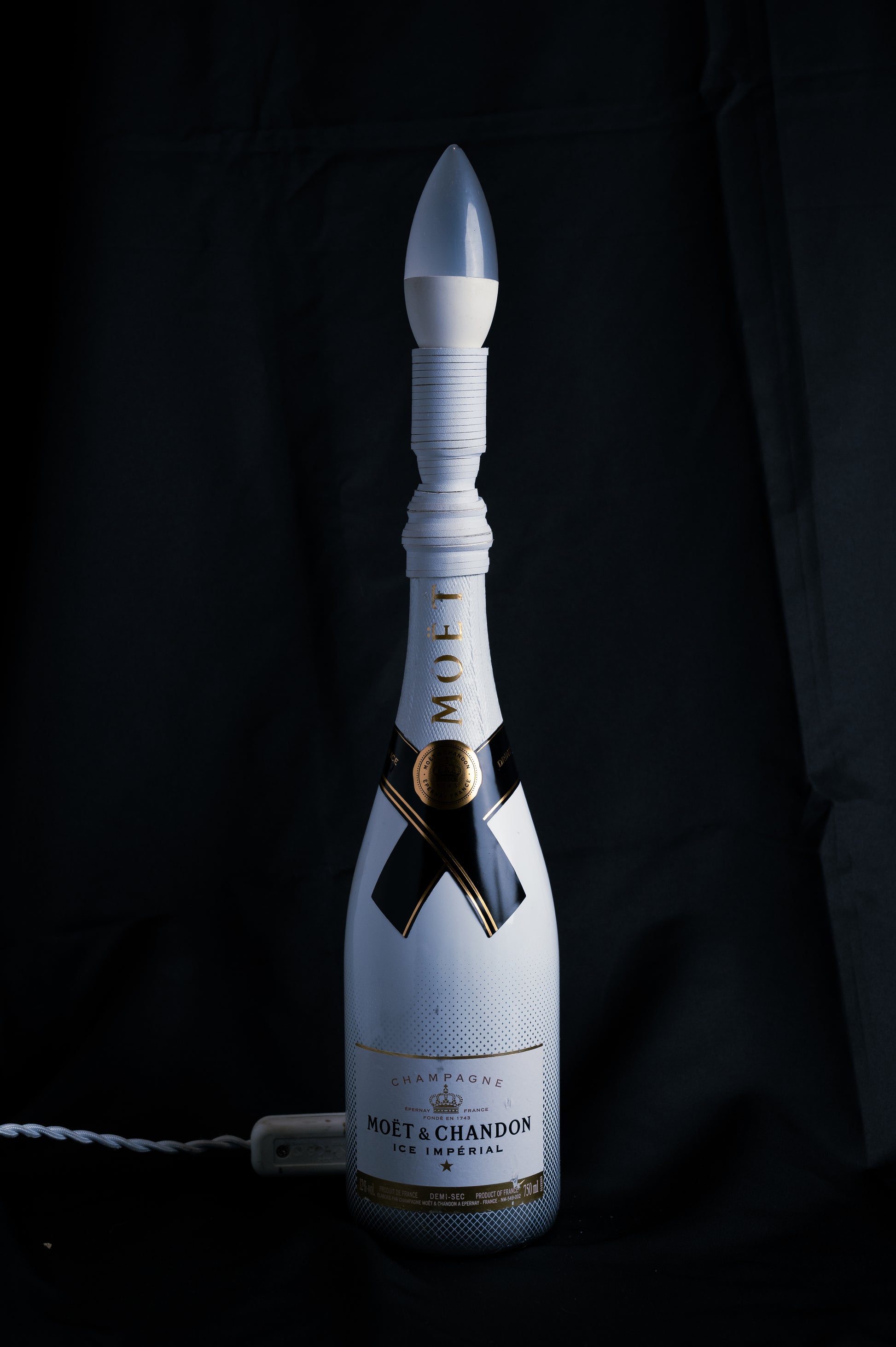 Bring elegance and personality into your space with the Cable-Lamp Notorious, a unique piece crafted from the iconic Moët & Chandon Ice Imperial bottle. With its total-white look and refined golden light projections, this lamp embodies luxury and artistry.