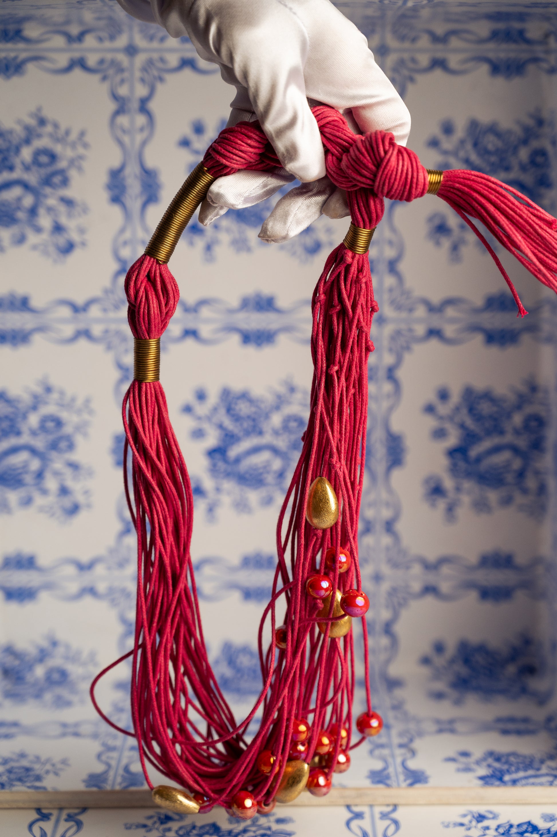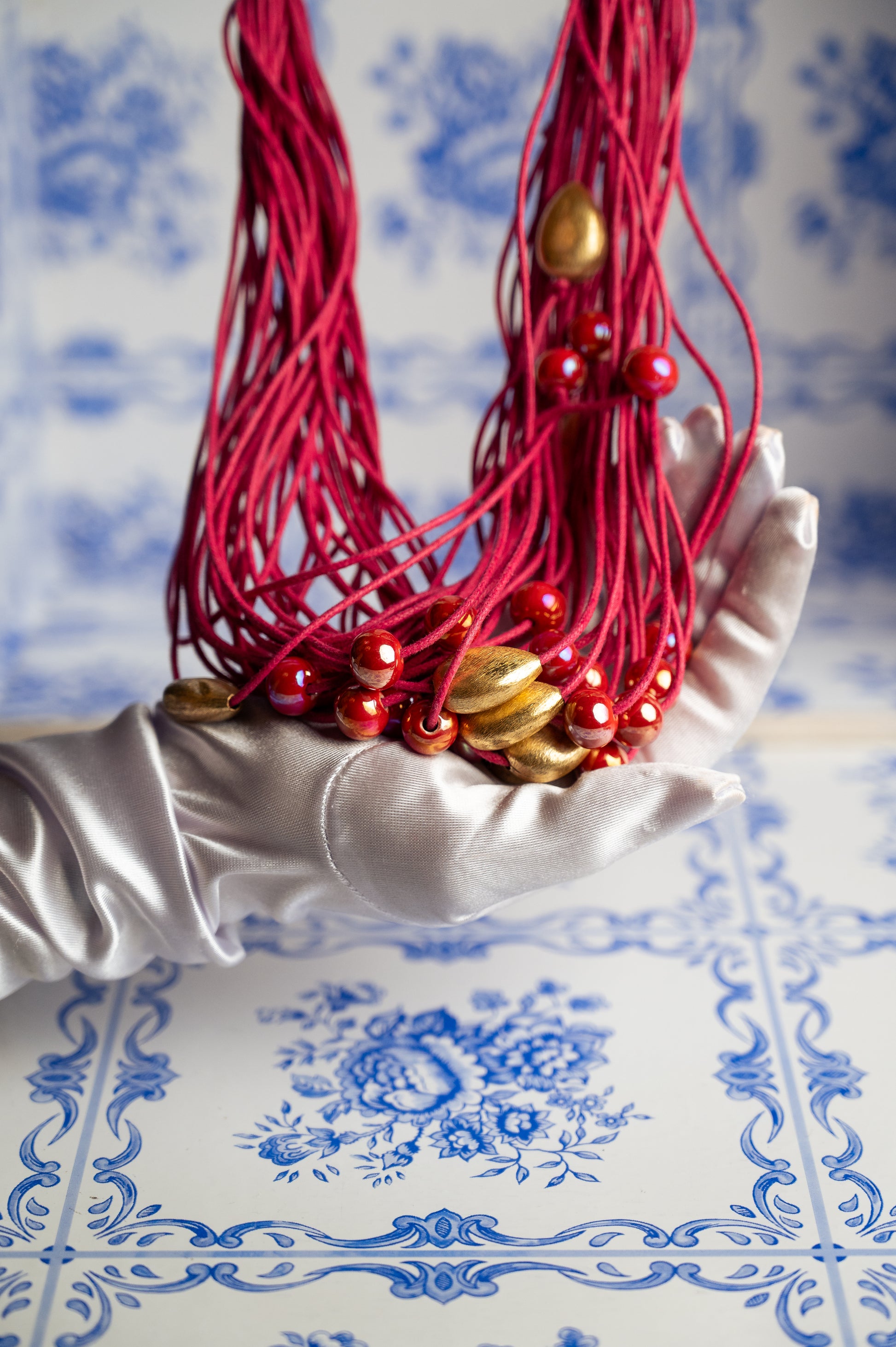 The Capri Necklace is a unique statement piece crafted with care and elegance. Handmade in Italy, it features vibrant pink waxed cord, golden brass drops, and hand-glazed ceramic beads. Each element is carefully assembled with brass closure and golden wire details, creating a bold and artisanal jewel. Perfect to elevate both casual and elegant outfits, Capri Necklace embodies sustainability, craftsmanship, and timeless beauty. Designed for those who love originality, color, and contemporary artisanal design.